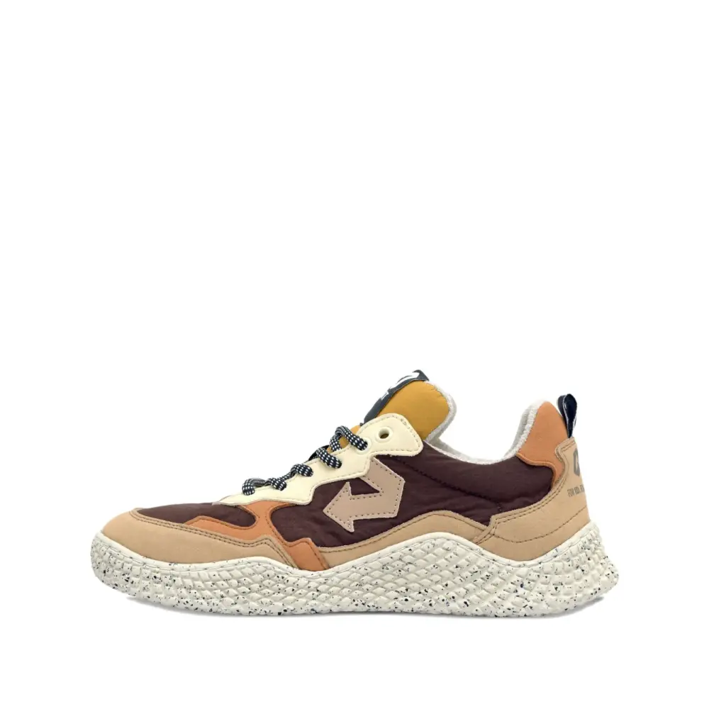 коричневый и разноцветный, аппликация в виде стрелы, текстурированная подошва, шнуровка, петля для натягивания, нашивка с логотипом