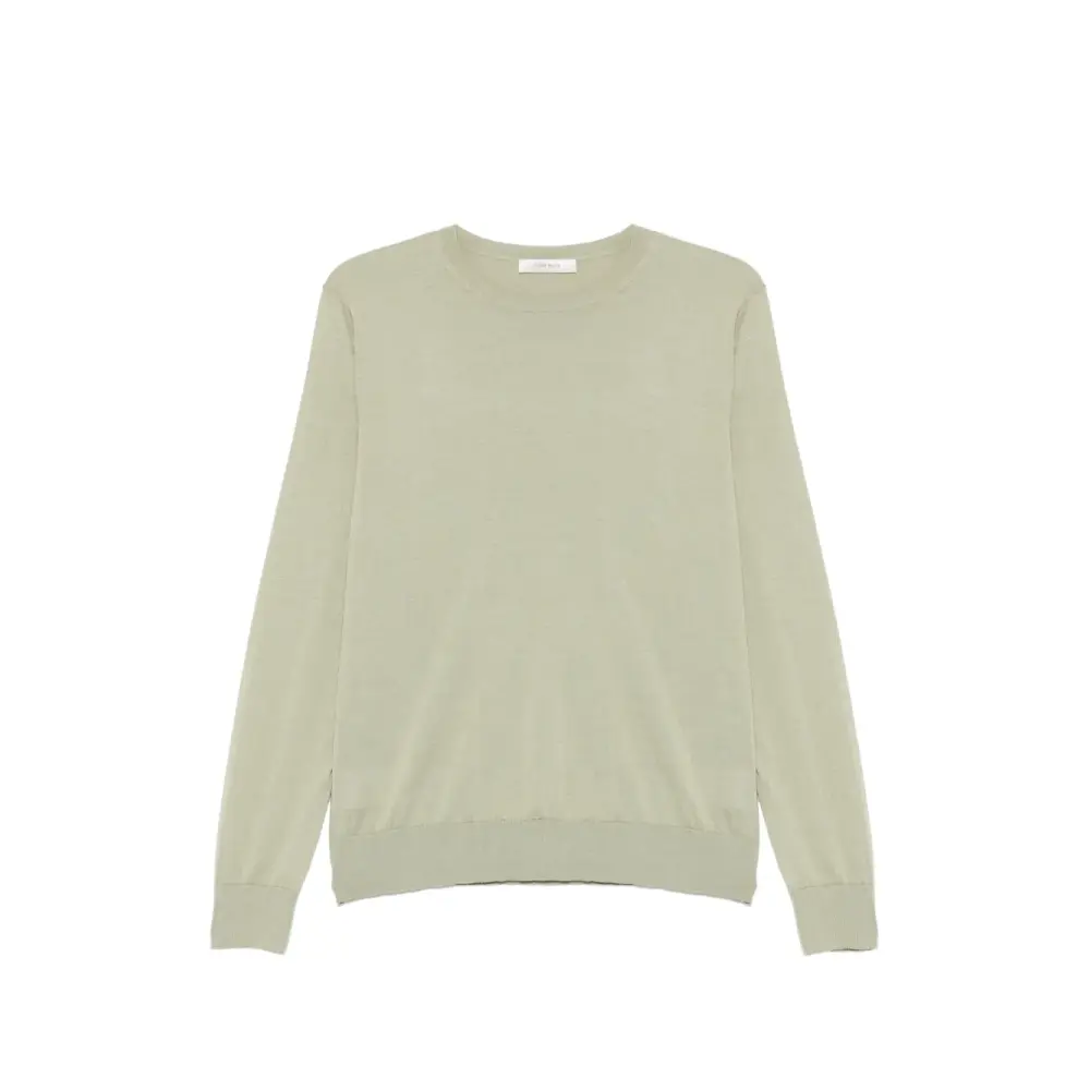 зеленый свитер с круглым вырезом, длинными рукавами, вязаной резинкой на манжетах и по низу