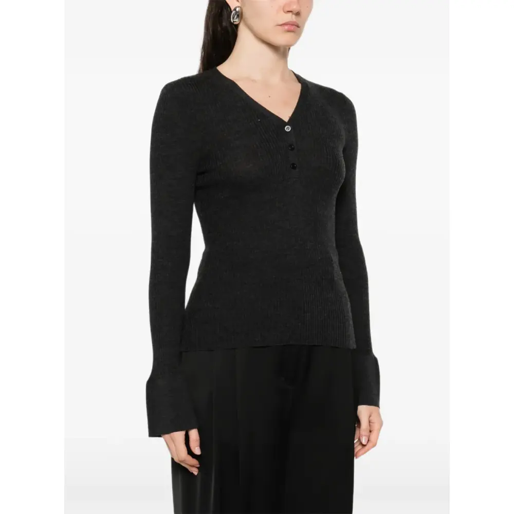 угольного цвета рубчатая трикотажная ткань, застёжка на пуговицы, длинные рукава, расклёшенные манжеты, круглый вырез