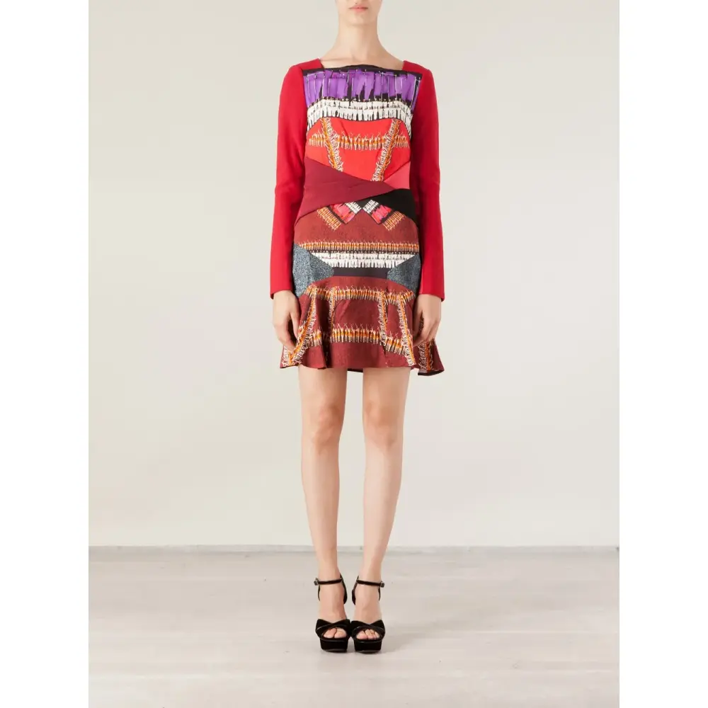 Красное платье с перекрученной деталью 'Twist' от Peter Pilotto. Квадратный вырез, абстрактный принт, потайная застёжка на молнии сзади, длинные рукава, плиссированная юбка.