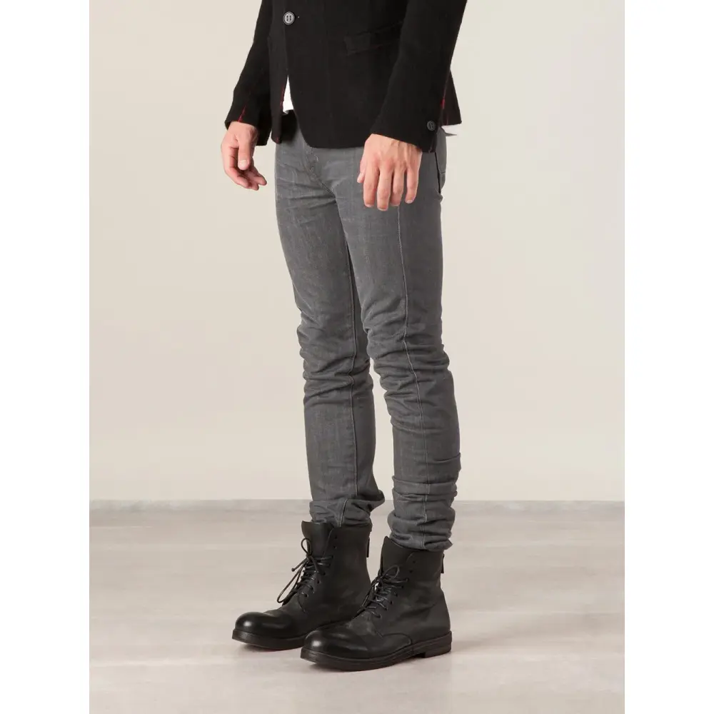 Темно-серые хлопковые очень узкие джинсы скинни от Mastercraft Union. Пояс с петлями для ремня, верхняя пуговица, потайная застёжка спереди, дизайн пяти карманов.