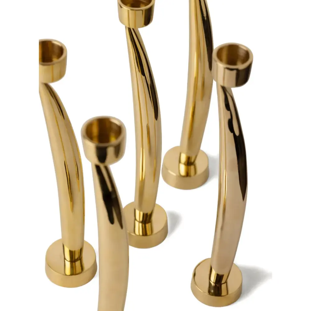 набор из пяти подсвечников с цилиндрическим основанием, изогнутым корпусом и верхом золотистого цвета
