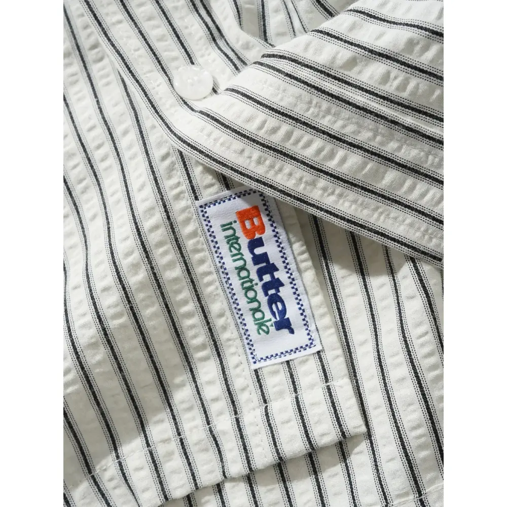 белая рубашка с полосатым принтом, вышивкой на груди, отложным воротником, длинными рукавами и застежкой на пуговицы