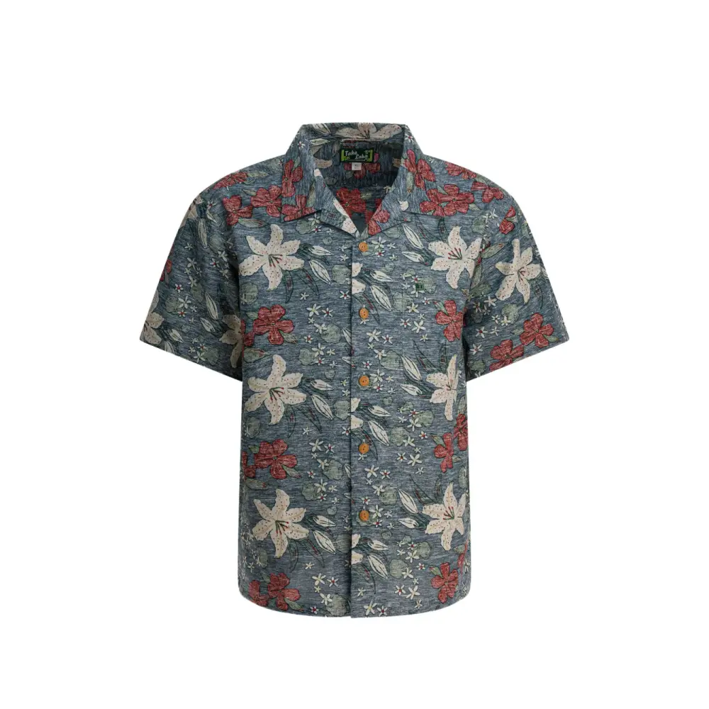 голубая рубашка с цветочным принтом, застёжкой на пуговицы, накладным карманом на груди, короткими рукавами и отложным воротником