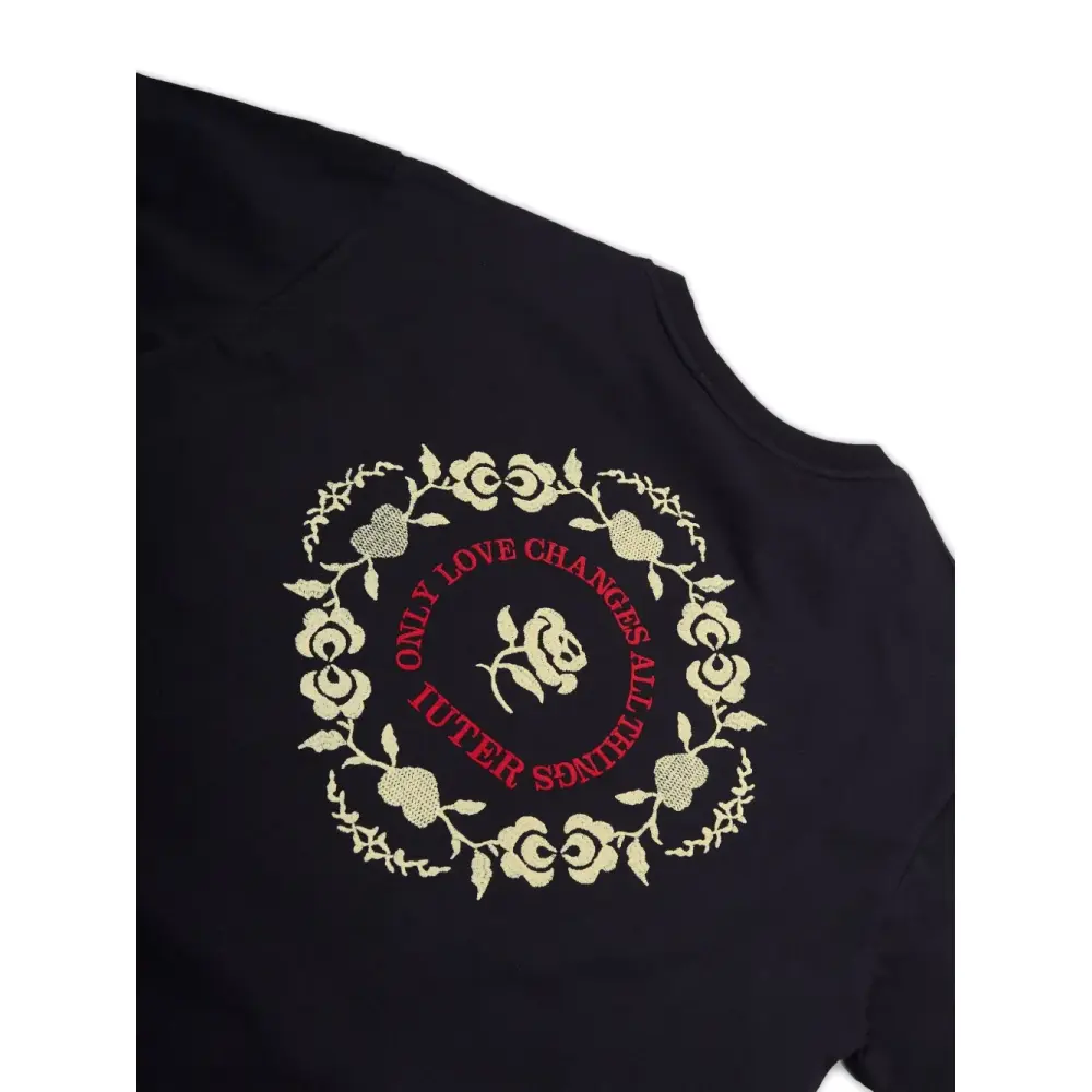 черная футболка с цветочной вышивкой, нагрудным карманом, ботаническим мотивом, круглым вырезом и короткими рукавами