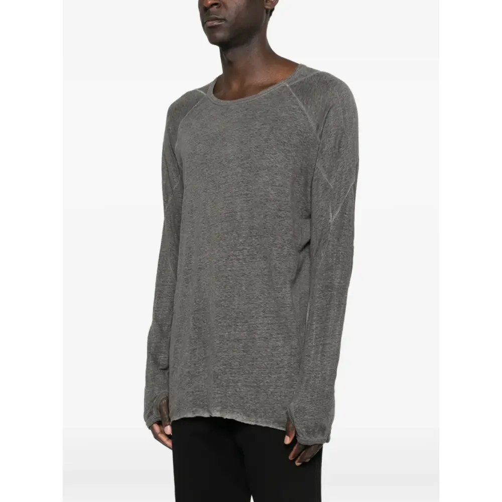 свитшот свинцово-серого цвета с круглым вырезом, панельным дизайном, длинными рукавами, прорезями для больших пальцев, необработанным краем