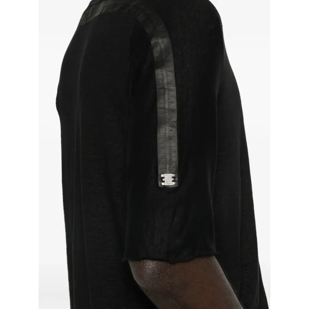 чёрная футболка с необработанным краем, круглым вырезом, короткими рукавами и швом на груди
