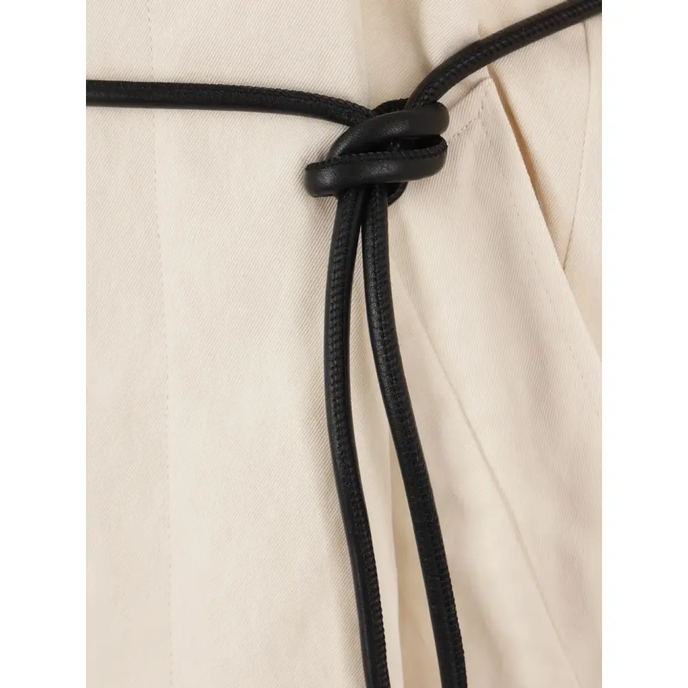 белый остроугольный воротник, застёжка на пуговицы с одной планкой, пояс на талии, длинные рукава, прямой низ, средняя длина