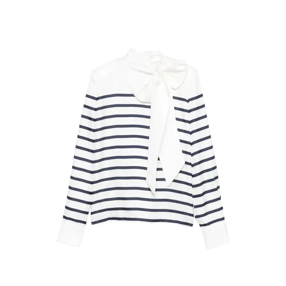 белая/темно-синяя полосатая шелковая блузка с бантом, длинными рукавами и отворотами на манжетах