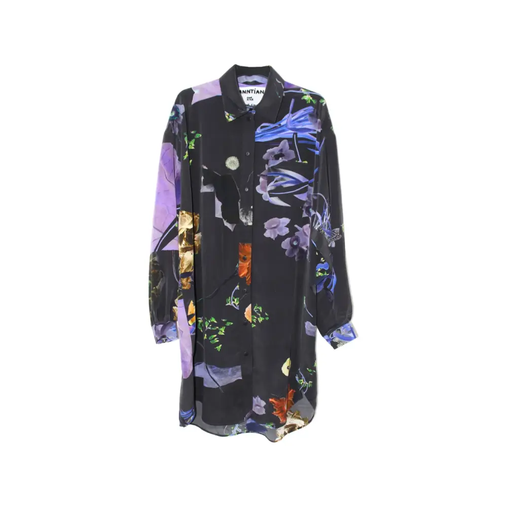 черная рубашка с цветочным принтом, застежкой на пуговицы, длинными рукавами, воротником и свободным кроем