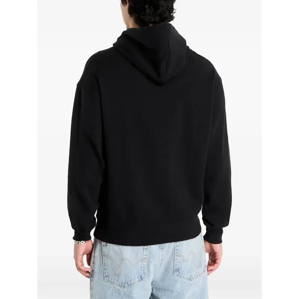 чёрная худи с нашивкой-логотипом, кулиской на капюшоне, передним карманом-кенгуру, длинными рукавами и ребристыми отделками
