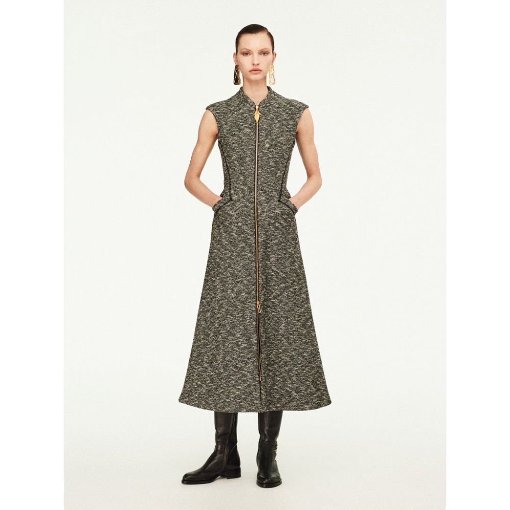 Это облегающее платье без рукавов из меланжевого серого джерси длиной до середины икры. Оно дополнено двусторонней металлической молнией золотистого цвета спереди, украшенной фирменным бегунком Bouche.