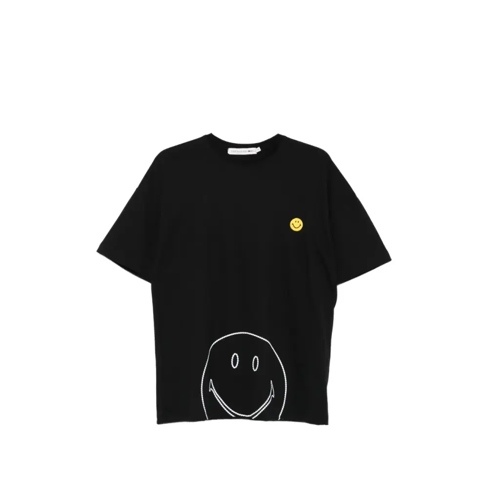 чёрная футболка с круглым вырезом, короткими рукавами, вышитым логотипом и мотивом "улыбающееся лицо"