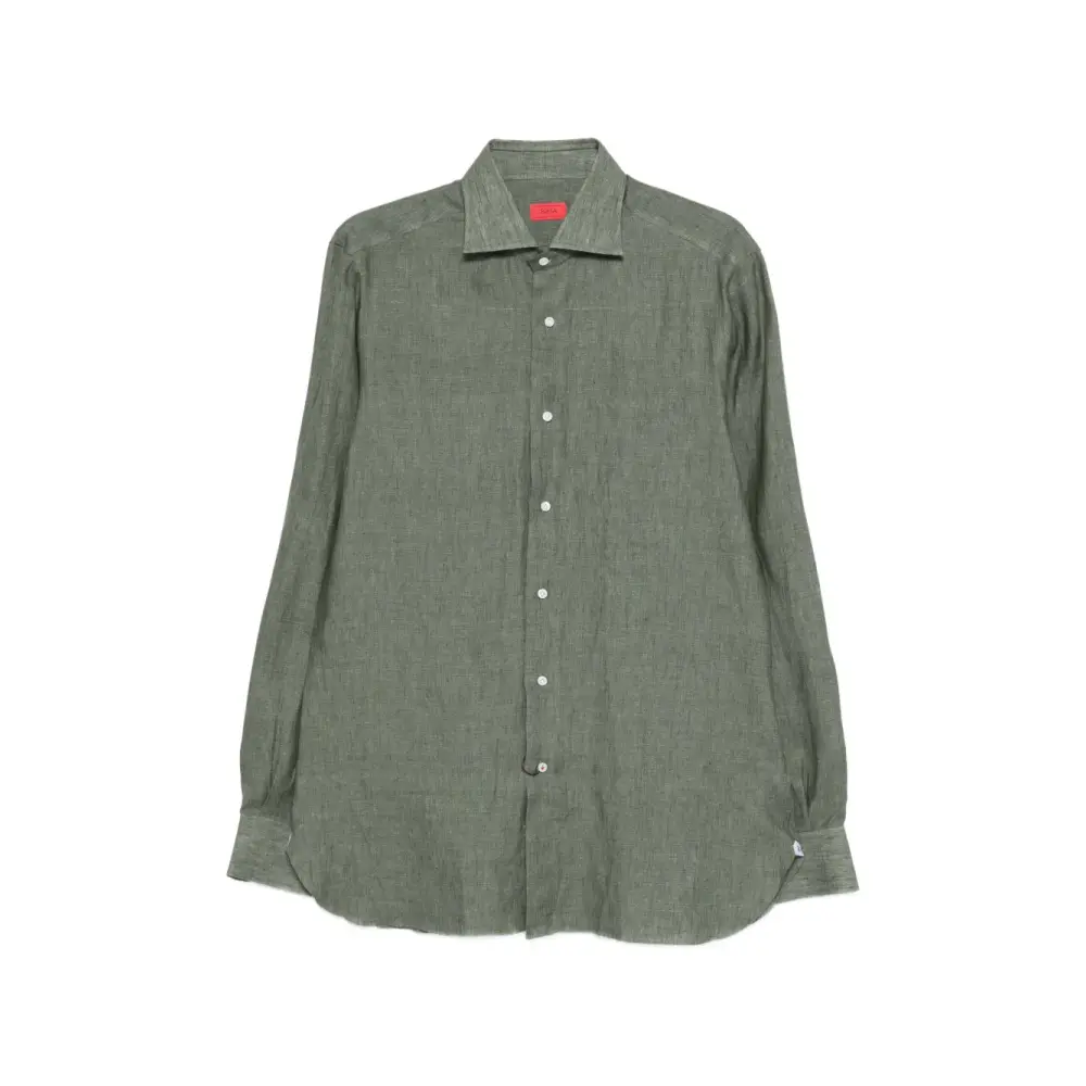 зелёная рубашка на пуговицах с длинными рукавами, манжетами на пуговицах и закруглённым подолом