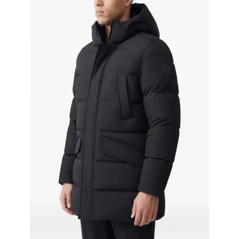 чёрная куртка с капюшоном, скрытая застёжка-молния спереди, накладные карманы спереди с клапанами, длинные рукава, стёганый эффект