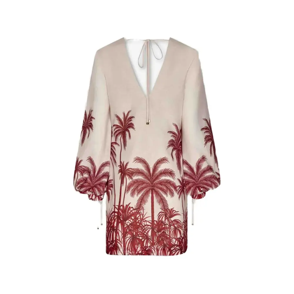 бежевый и красный топ с тропическим принтом, V-образным вырезом, длинными рукавами, завязками и присборенными манжетами