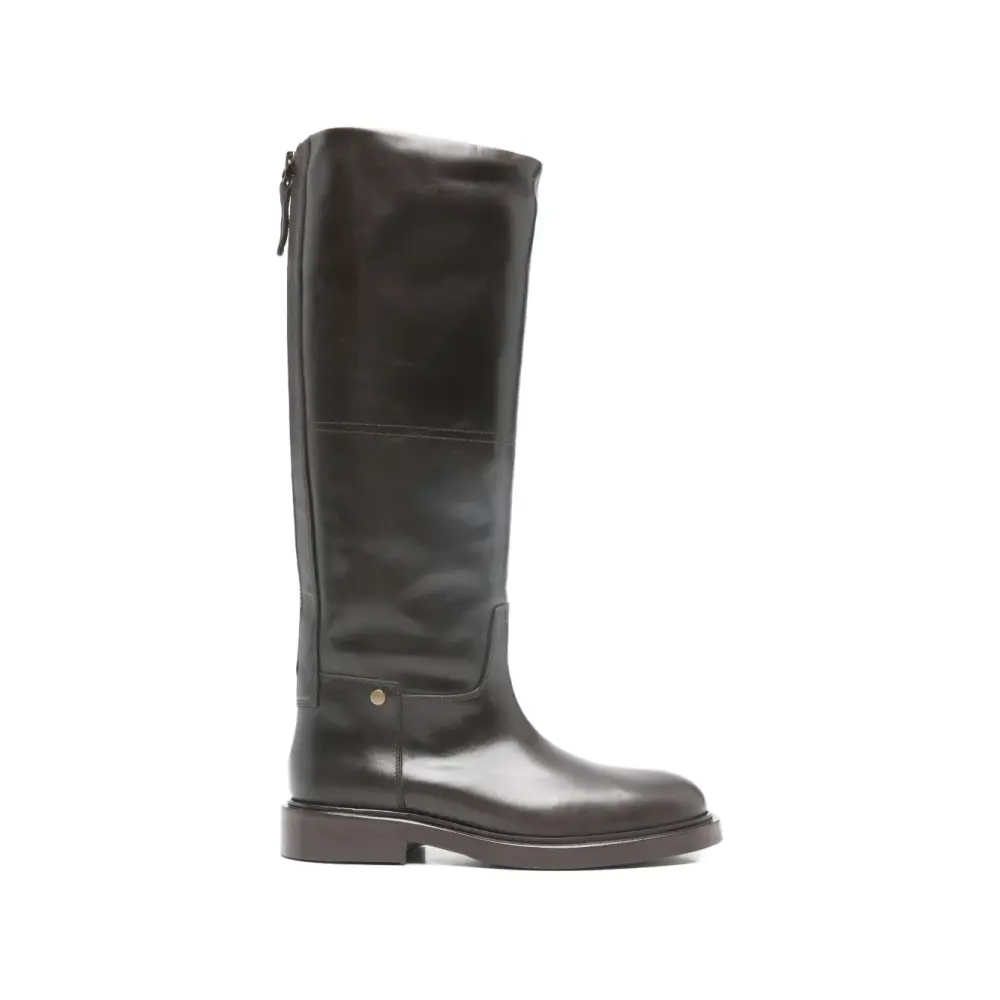 темно-коричневый, застежка-молния сзади, круглый носок, плоская подошва, тональная строчка, кнопочная деталь