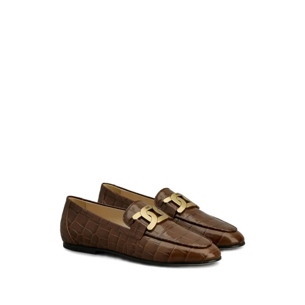 коричневый цвет, фурнитура золотистого оттенка, модель без застёжки, плоская подошва, логотип