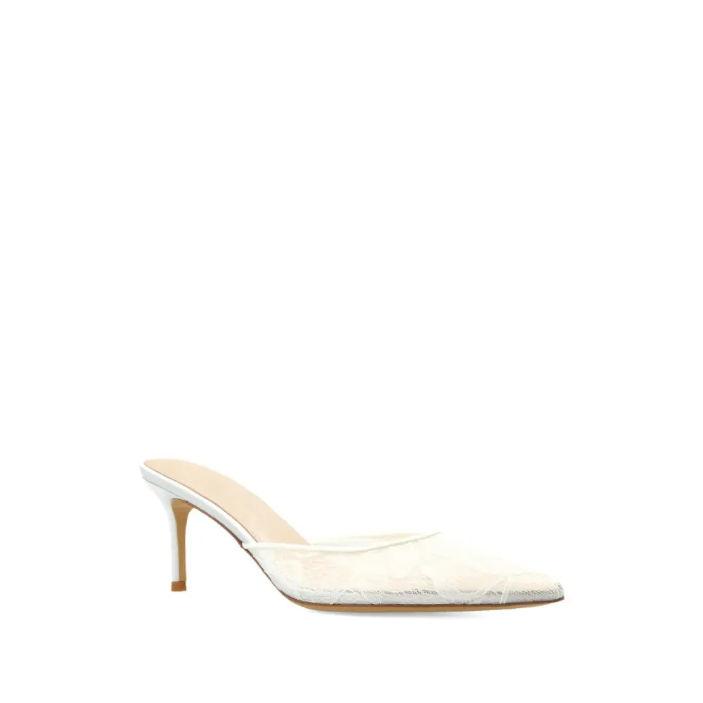 бежевые туфли с заострённым носком, шпилькой, открытой пяткой и кружевными вставками