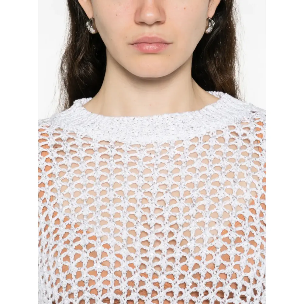 белый ажурный дизайн, круглый вырез, длинные рукава, ребристые манжеты и низ