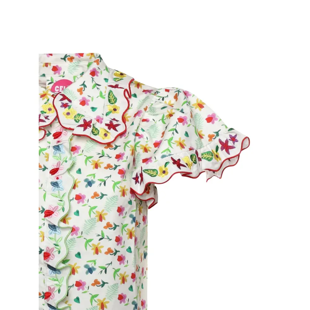 белый топ с цветочным принтом, волнистым воротником и рукавами с оборками