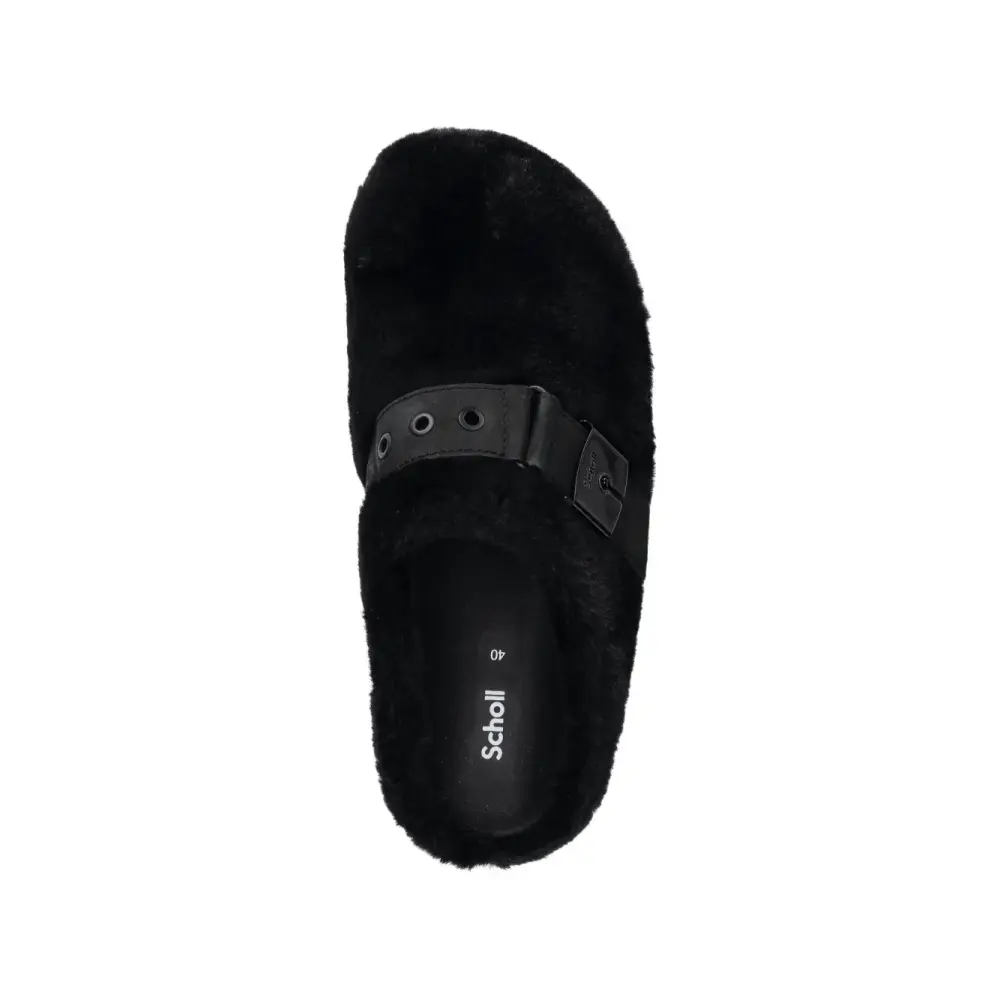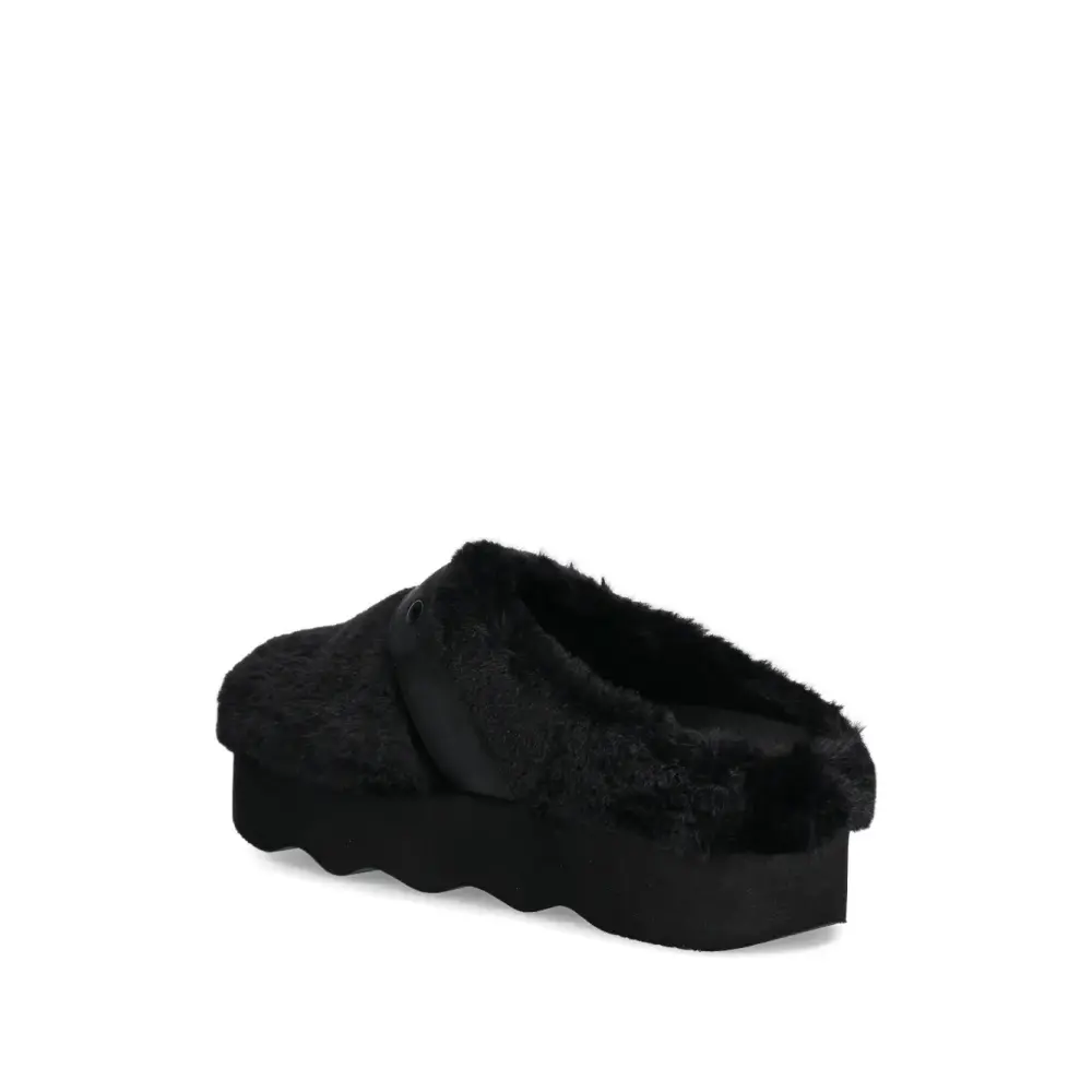 чёрные с отделкой из искусственного меха, застёжкой-пряжкой, на платформе, стиль мюли, фактурная подошва