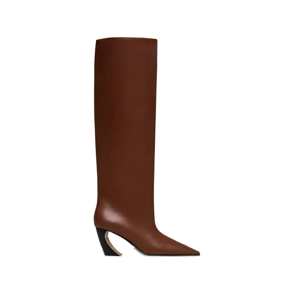 глубокий эспрессо, дизайн до колена, заострённый носок, фигурный каблук