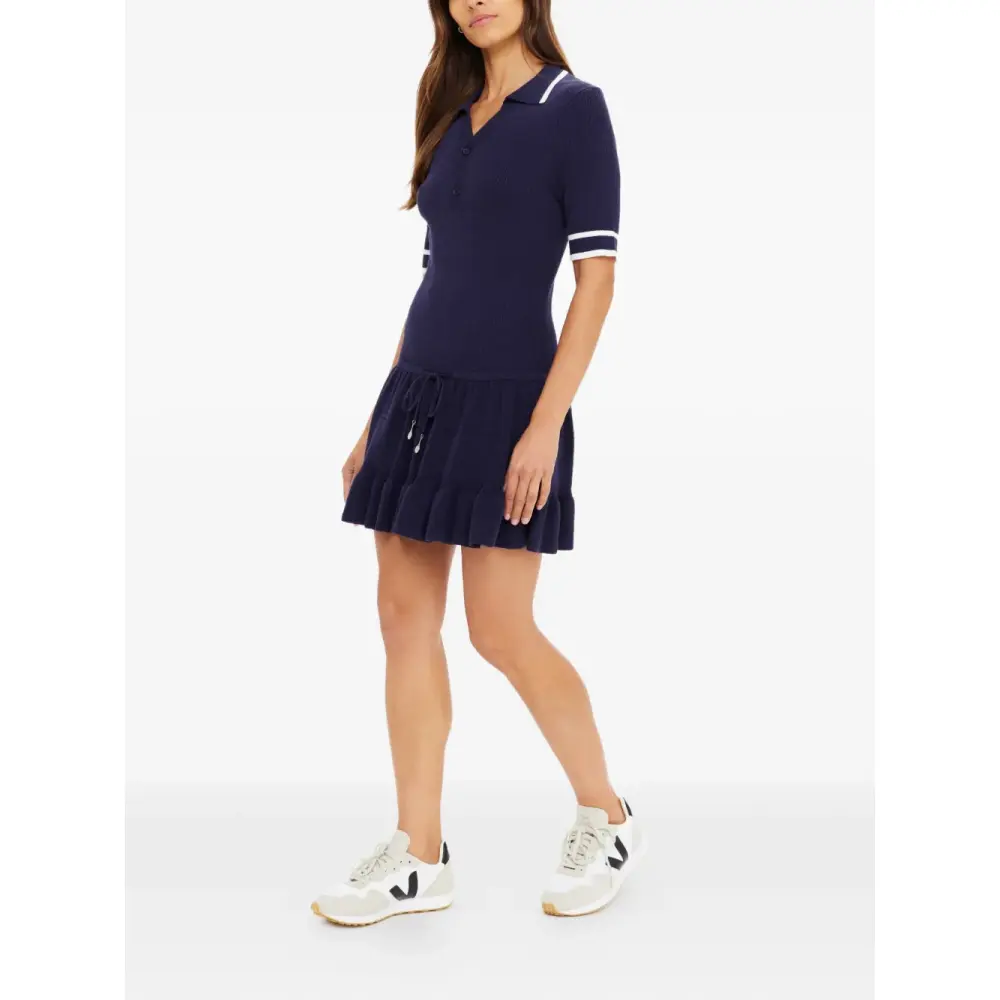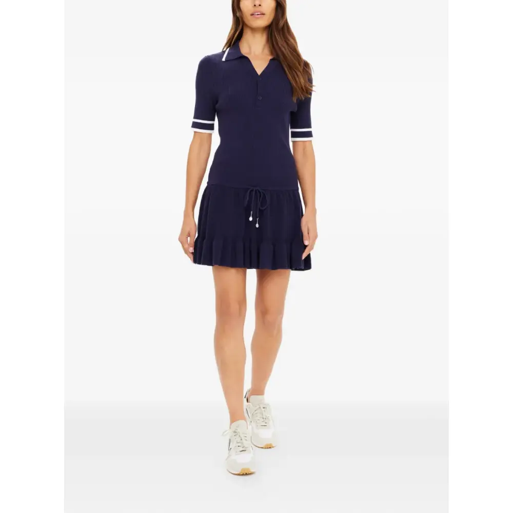 тёмно-синяя юбка с оборками, кулиской, из рубчатого трикотажа, фурнитура серебристого оттенка, отложной воротник