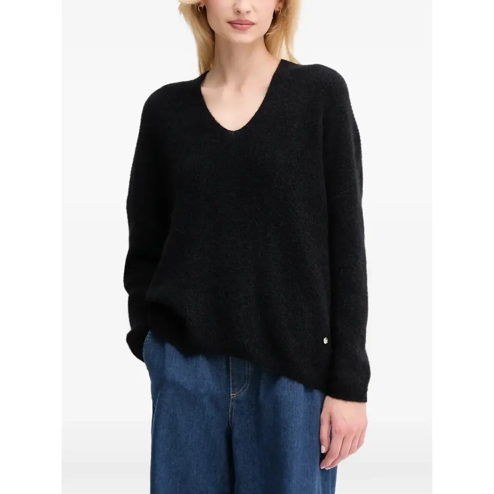 черный длиннорукавный топ с V-образным вырезом и аппликацией