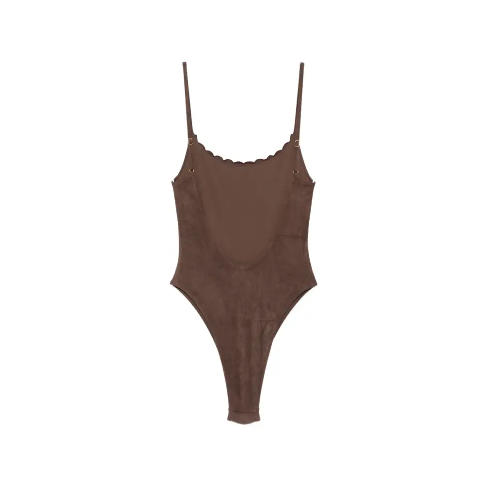 коричневый купальник с цветочной вышивкой, зубчатой отделкой и тонкими бретелями. Пожалуйста, примерьте купальник поверх собственного белья.