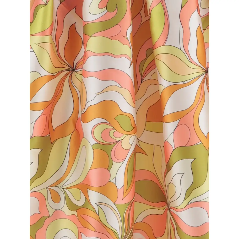оранжевый и зелёный принт по всей поверхности, силуэт А-силуэта, застёжка-молния сбоку, два боковых кармана