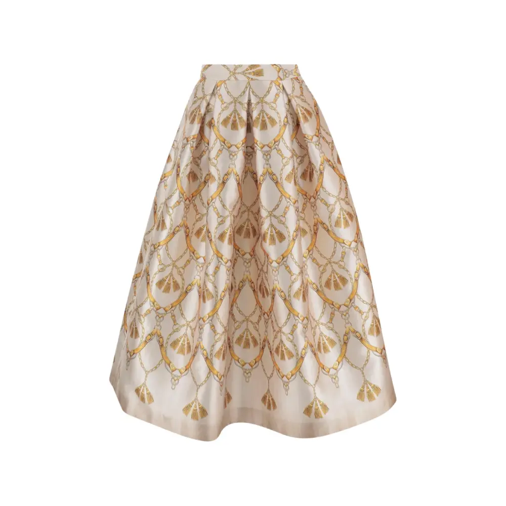 светло-жёлтый с фантазийным принтом, боковой застёжкой-молнией, двумя боковыми карманами, расклёшенный