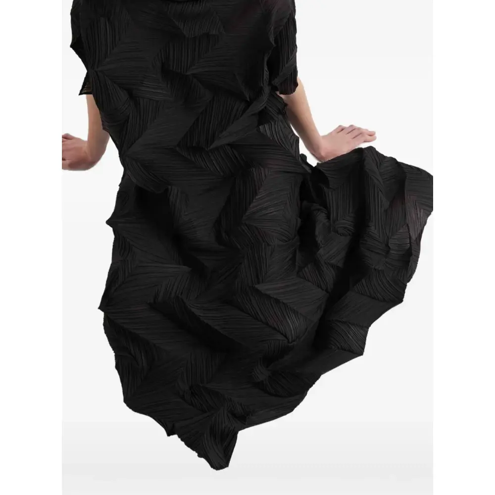 черный цвет, геометрический узор, плиссированный дизайн, короткие рукава, расклешенный силуэт, круглый вырез, средняя длина