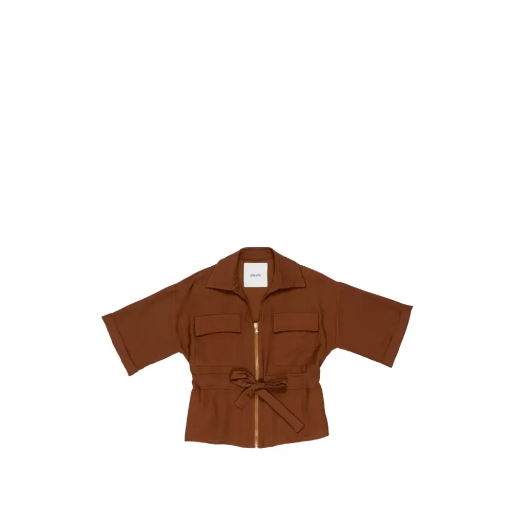 коричневый цвет, накладные карманы на груди, ремень, застёжка на молнии