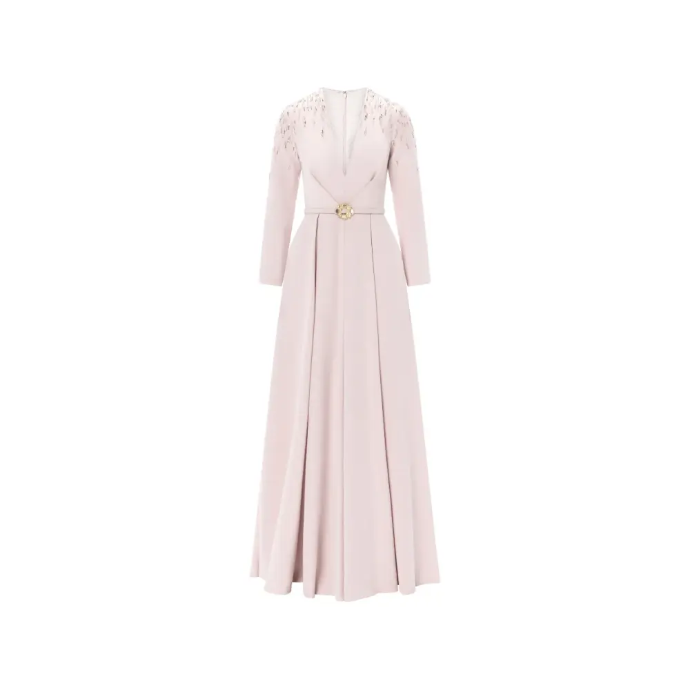 розовый с бисерной вышивкой, V-образным вырезом, поясом, разрезом спереди и конструкцией из панелей