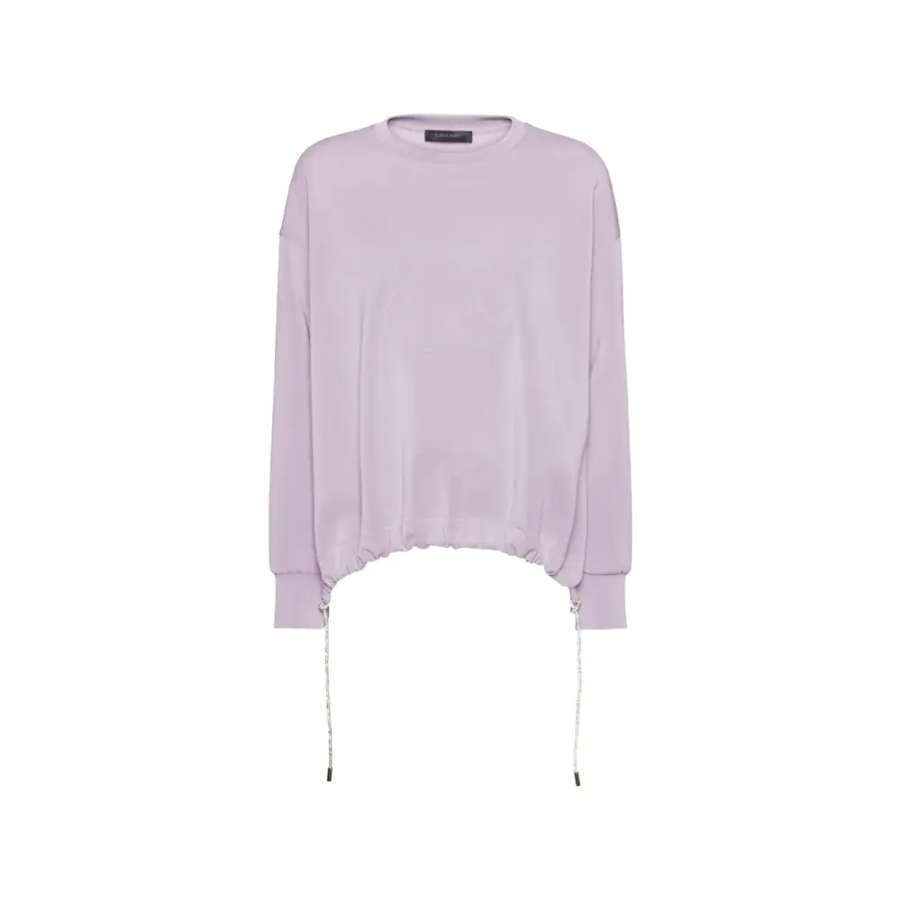 сиреневый цвет, тисненые детали, кулиска по подолу, круглый вырез, длинные рукава, ребристая отделка