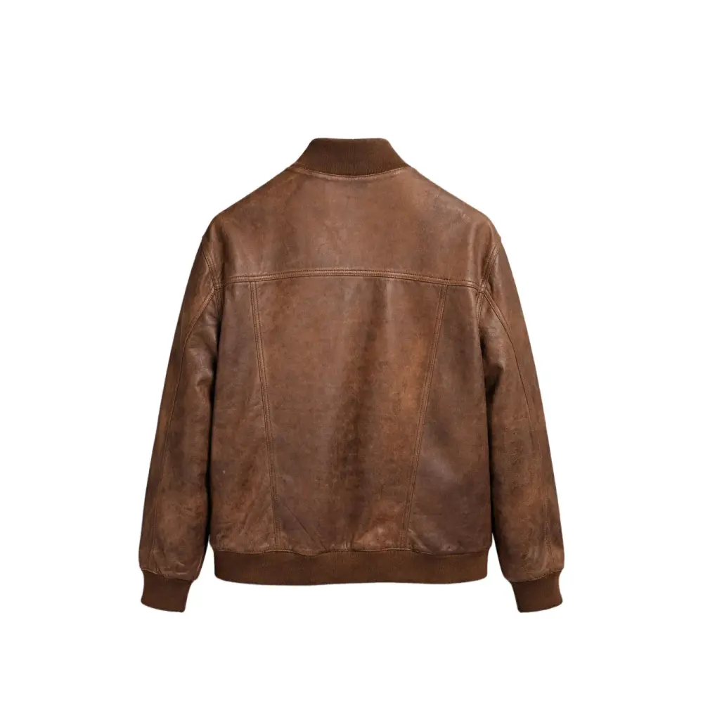коричневая кожаная куртка с застежкой на пуговицы, передними клапанными карманами, трикотажными манжетами и поясом, высоким воротником