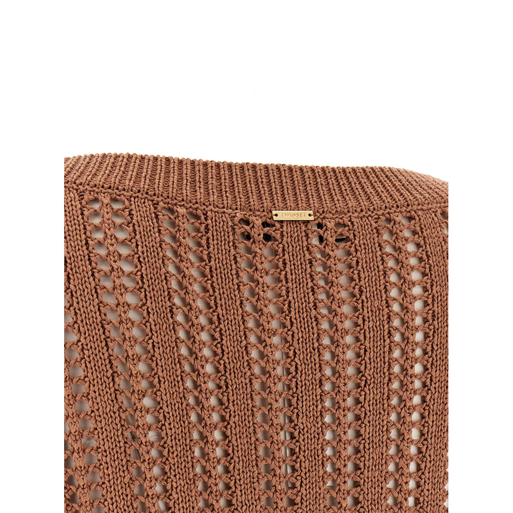 Свитер из смеси хлопка и вискозы с ажурным вязаным узором, украшением из страусиных перьев в тон на передней части, вырезом «лодочка», длинными рукавами со спущенной линией плеч и расклёшенными манжетами.