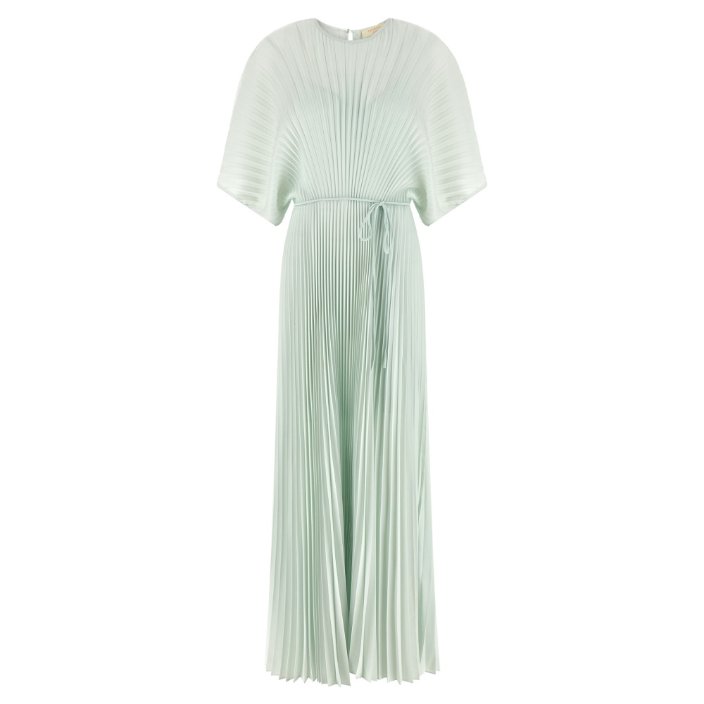 Длинное платье из плиссированного крепдешина в стиле ампир, с завышенной линией талии, круглым вырезом, застежкой на пуговицу сзади и каплевидным вырезом, рукавами 3/4 свободного кроя, расклешенной юбкой, боковой молнией, подкладкой, съемным поясом.