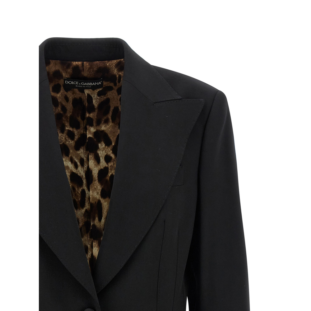 Однобортный пиджак из шерстяной габардины 'Turlington' с застёжкой на пуговицы спереди, острыми лацканами, клапанами на карманах, нагрудным карманом, вытачками, подплечниками, длинными рукавами, разрезом сзади и шелковой подкладкой с анималистичным принтом.