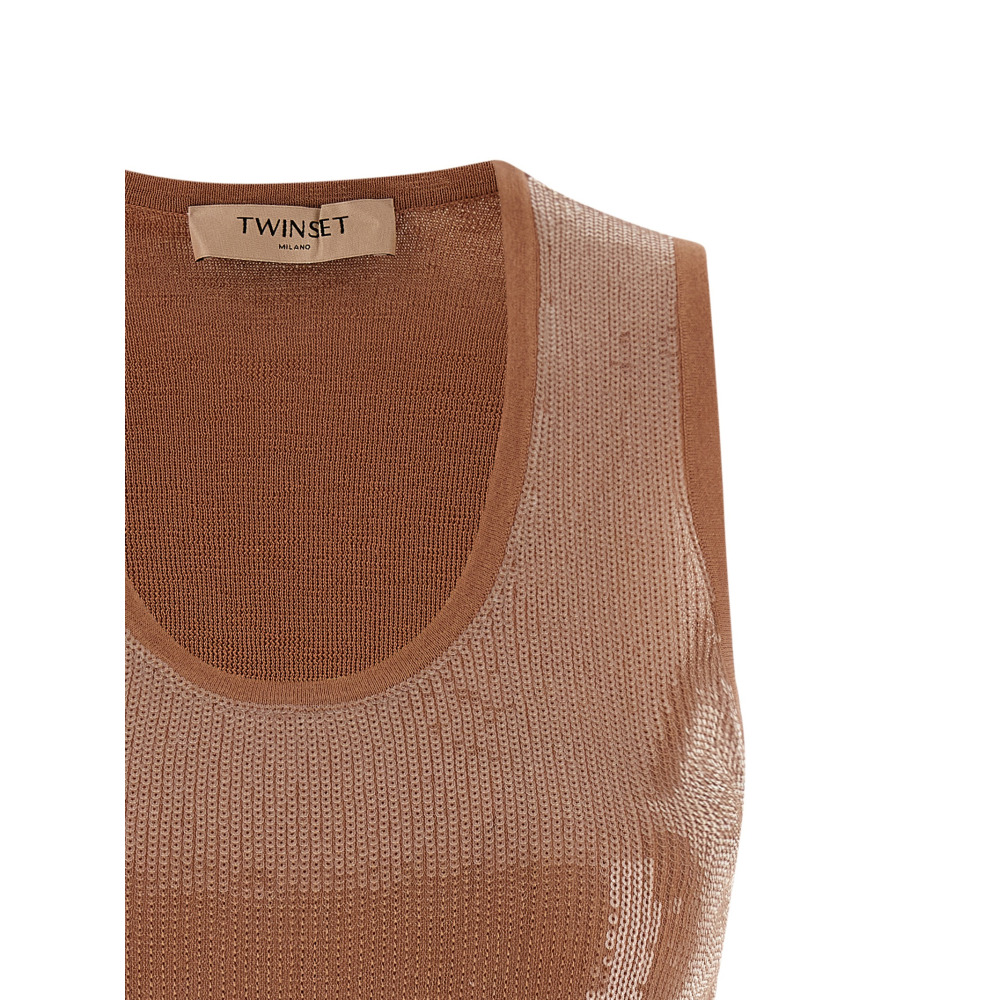 Вязаный топ из хлопковой смеси с тон-в-тон аппликацией из пайеток спереди, круглым вырезом, металлической биркой с гравированным логотипом на спинке.