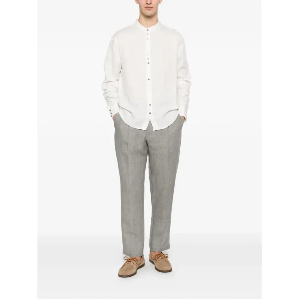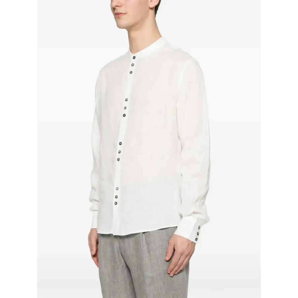 белая рубашка с застежкой на пуговицы, длинными рукавами, манжетами на пуговицах и изогнутым подолом