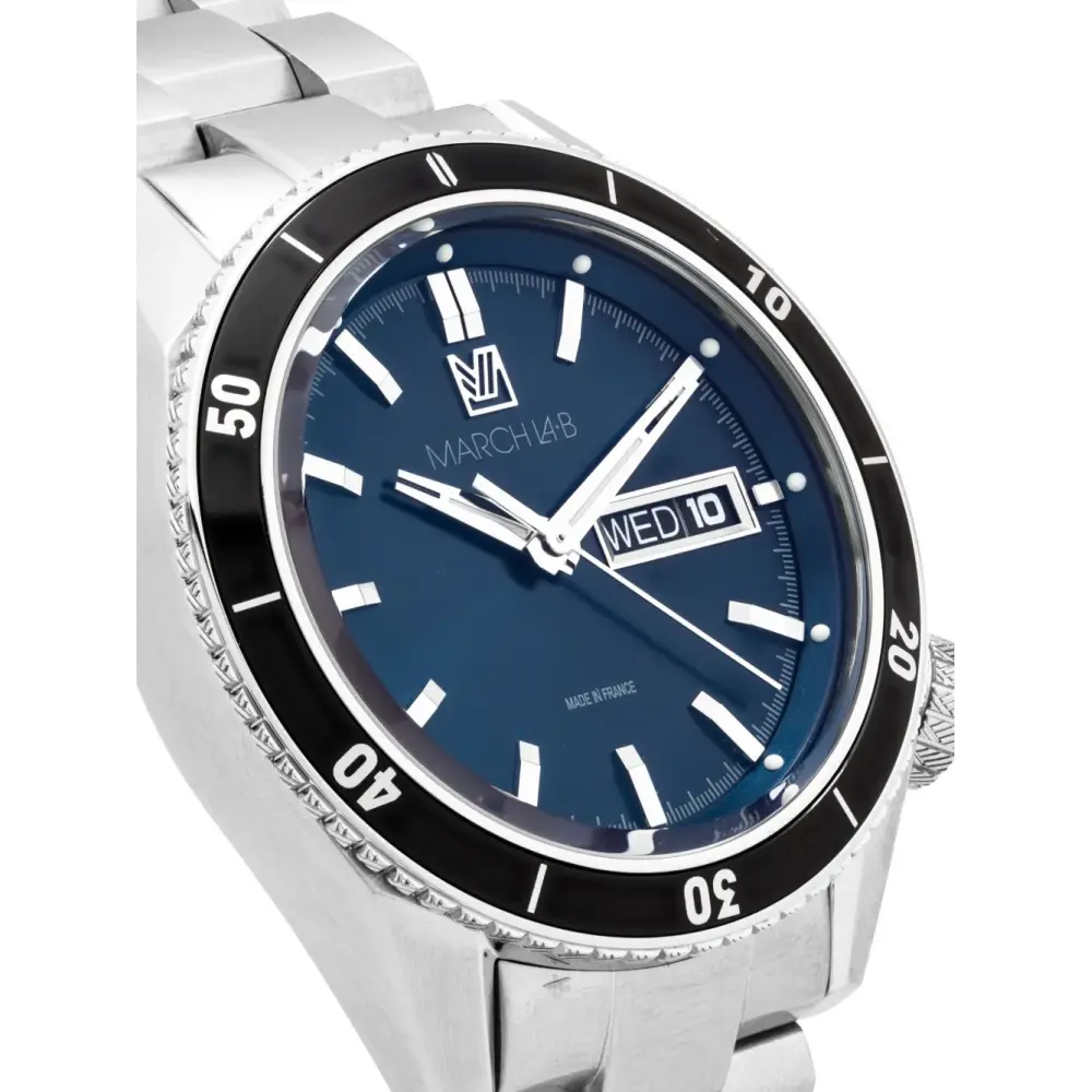 Темно-синий, нержавеющая сталь, круглый корпус, прямоугольные вытянутые индексы, прямоугольные вытянутые стрелки, индикатор даты, вращающийся безель, завинчивающаяся заводная коронка, регулируемый браслет со звеньями и потайная застежка. На этот товар распространяется стандартная двухлетняя гарантия от производителя.