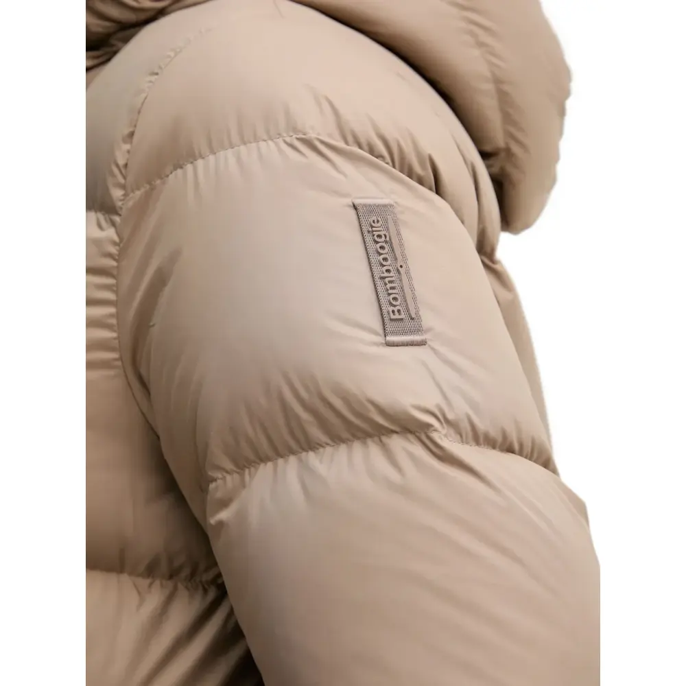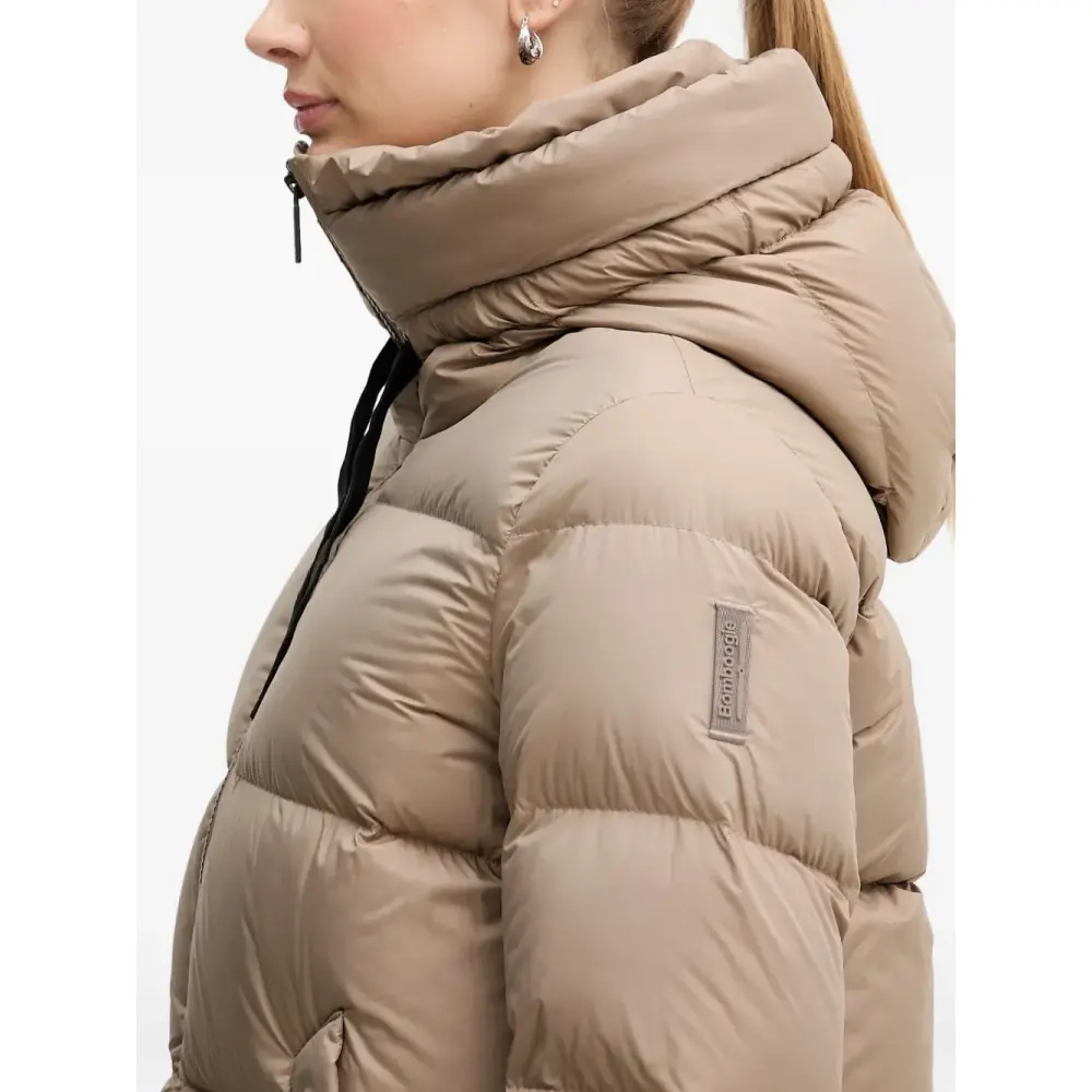 коричневый пуховик с капюшоном, застёжкой на молнию, нашивкой-логотипом и прорезными карманами
