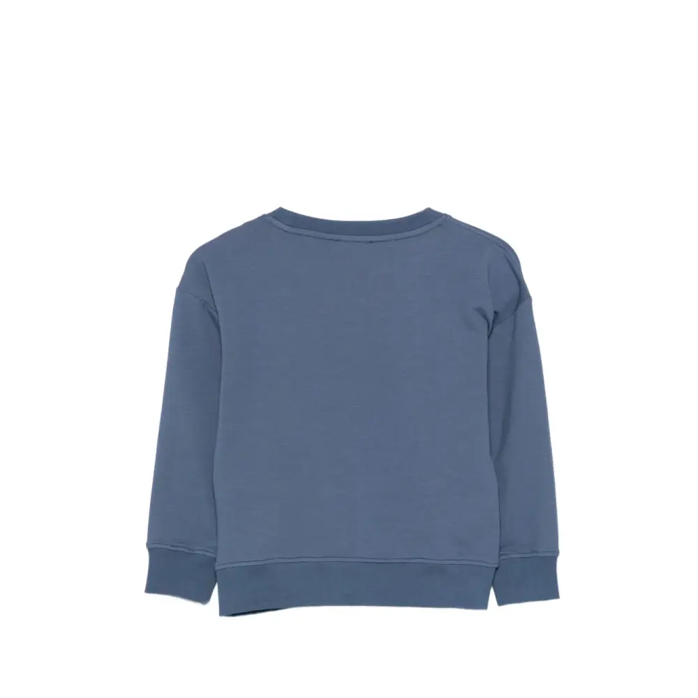 синий свитшот с деталями логотипа, круглым воротом, длинными рукавами, ребристым подолом и манжетами