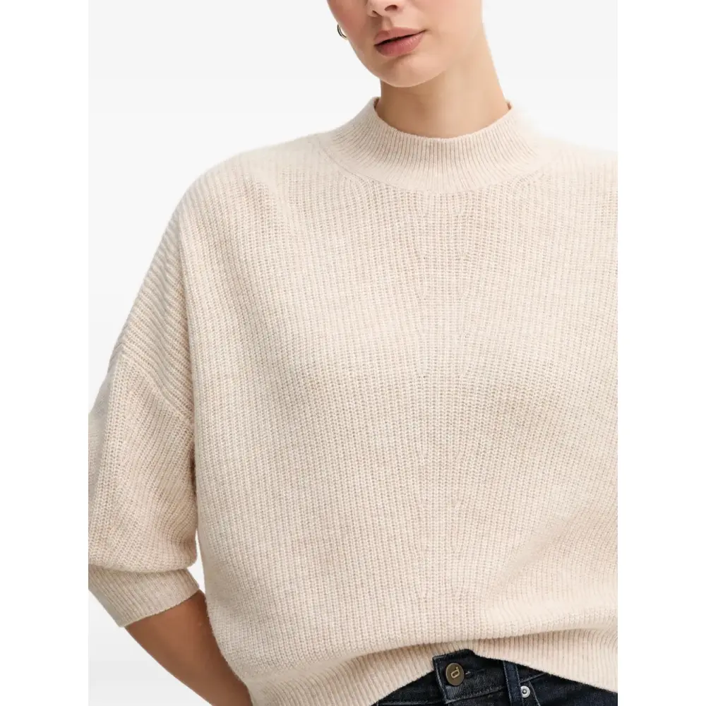 бежевый вязаный топ в рубчик с воротником-стойкой и рукавами три четверти