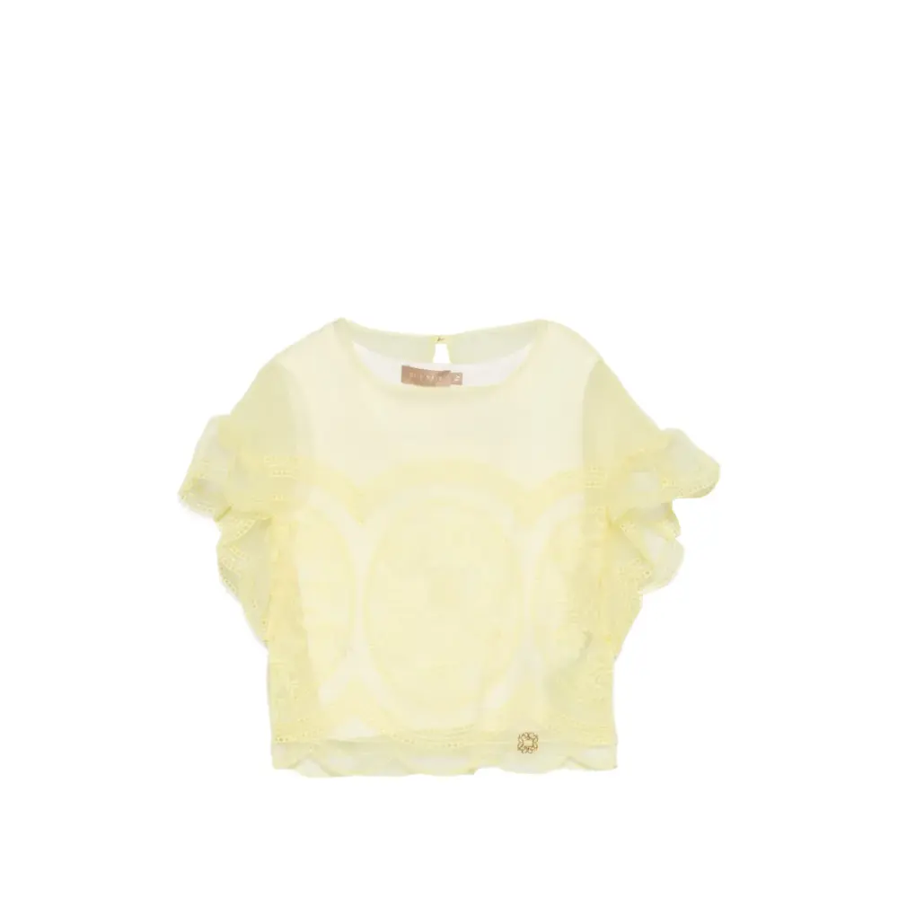 жёлтый комплект из двух предметов с вышивкой, отделкой оборками, круглым вырезом, короткими рукавами и фигурным краем