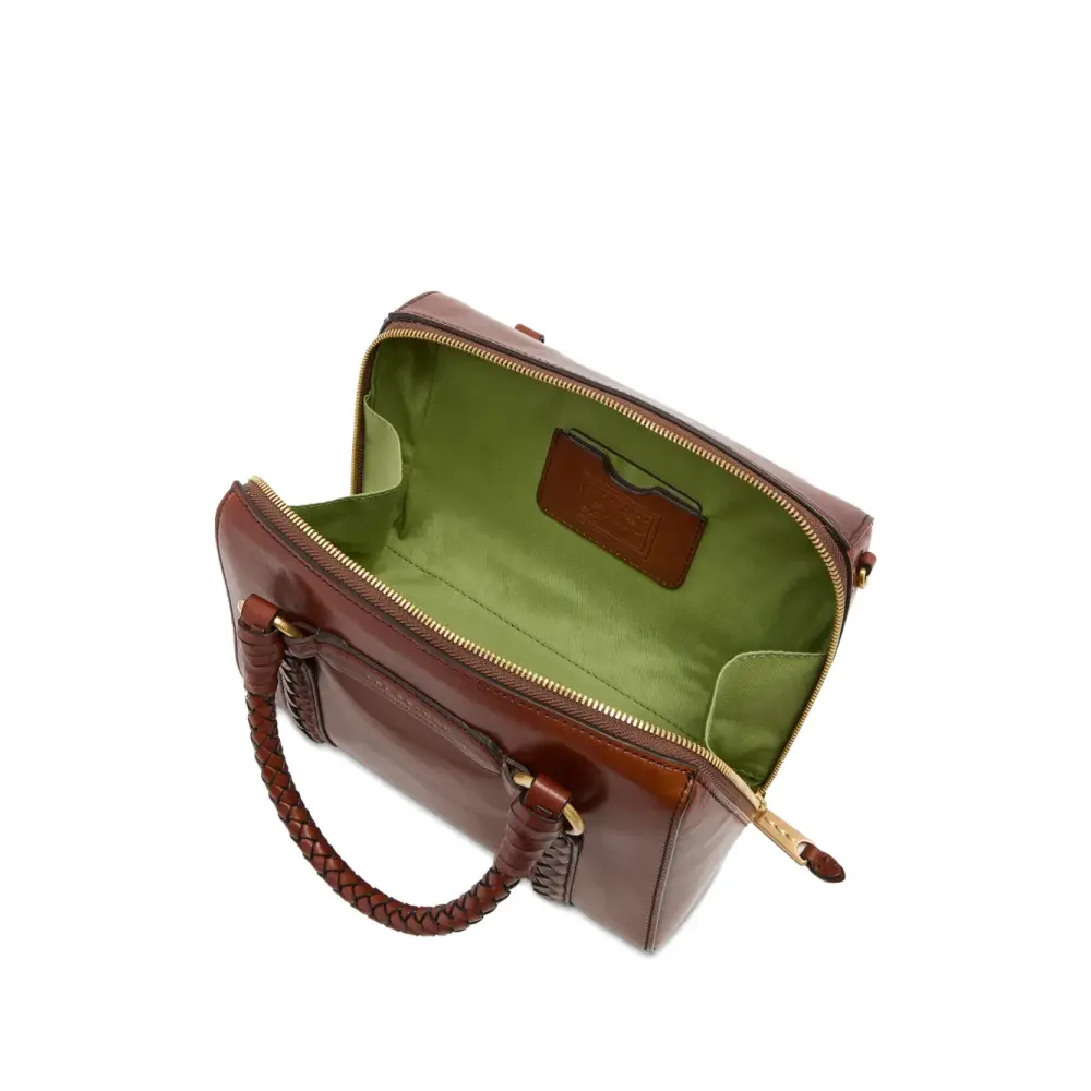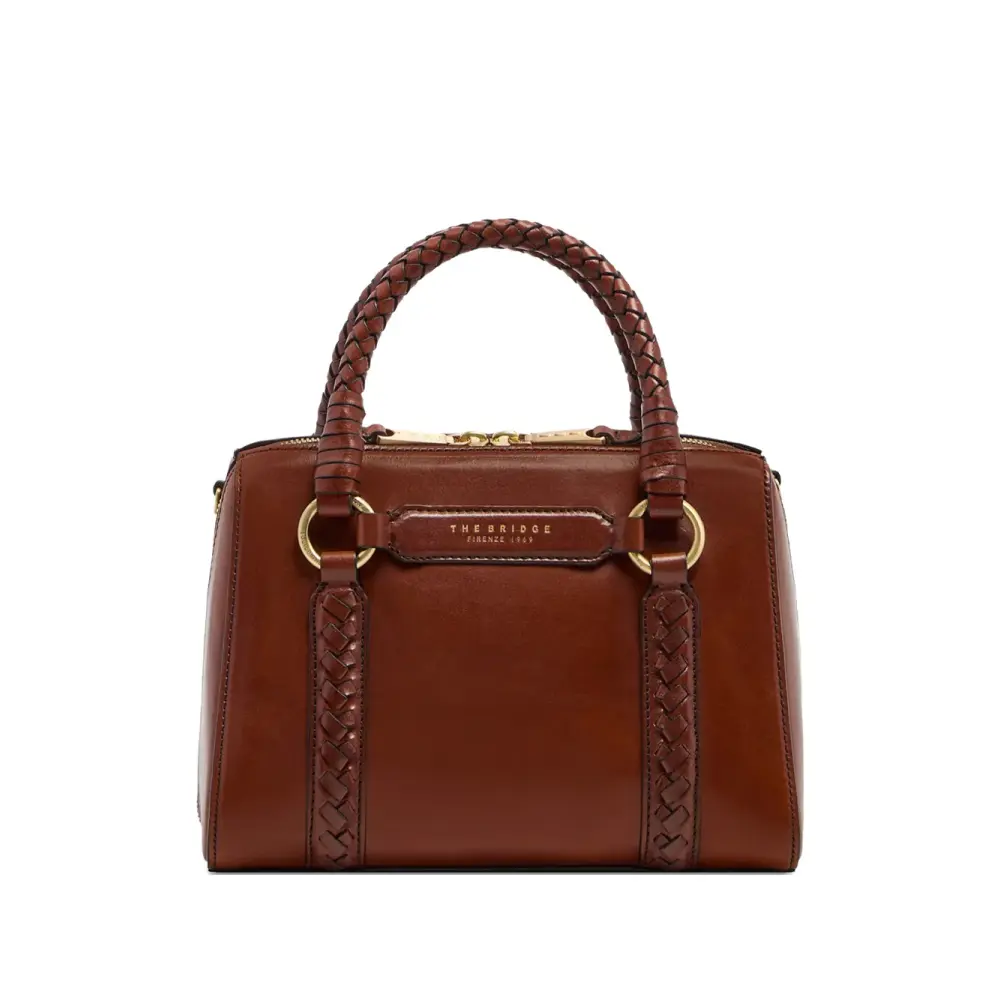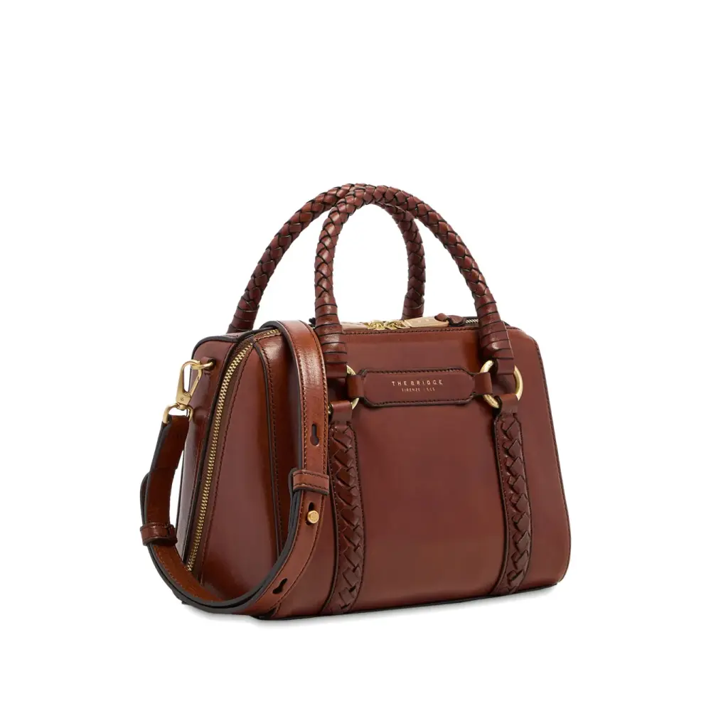 коричневая кожаная плетёная верхняя ручка, фурнитура цвета золота, верхняя застёжка на молнии, съемный плечевой ремень