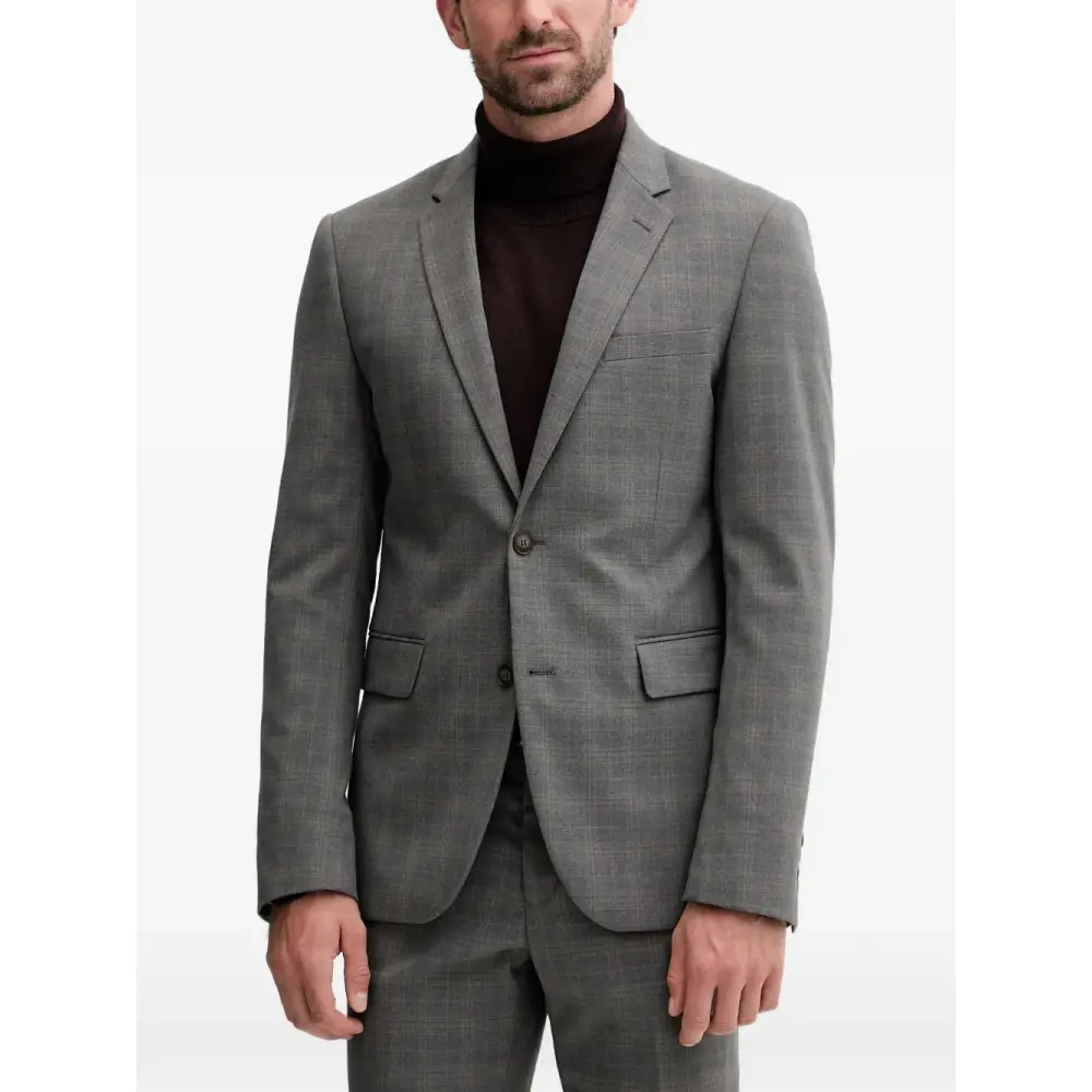 серый клетчатый узор, застежка на пуговицы, накладные карманы с клапанами, манжеты на пуговицах, шлевки для пояса