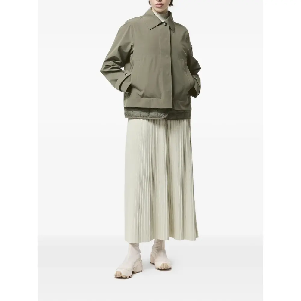 темно-зеленого цвета, застежка на пуговицы, стеганая подкладка, отложной воротник, длинные рукава, прорезные карманы